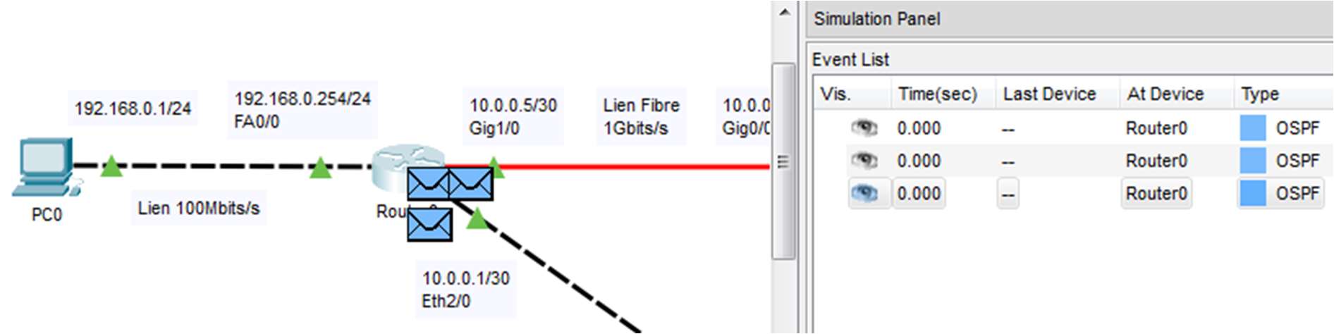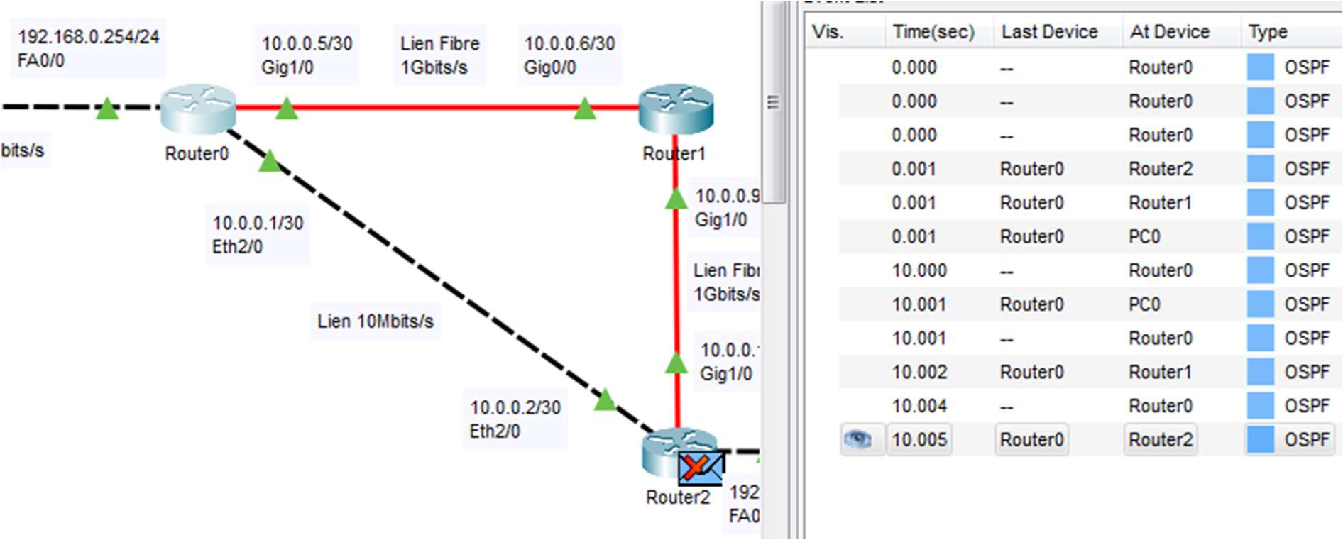 Un certain nombre d’échanges OSPF vont maintenant être réalisés entre routeur 0 et routeur 2 pour qu’ils puissent mettre à jour leurs tables de routage.
