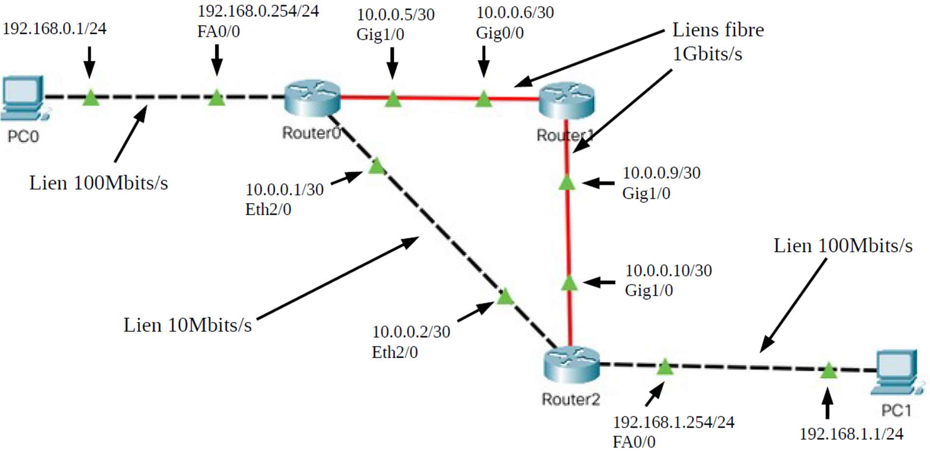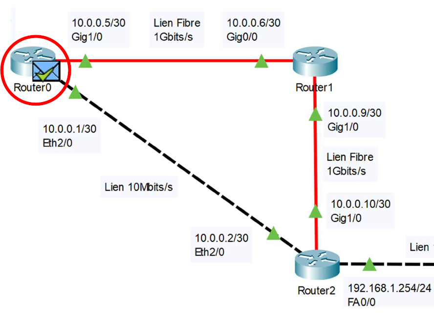 Étant donné qu’avec un protocole de routage RIP, le meilleur chemin est celui qui comporte le moins de « saut », alors un message échangé entre PC0 et PC1 passe par Routeur 0 puis Routeur 2, c’est à dire la connexion Ethernet 10 Mbits/s. Alors qu’un chemin – qui certes comporte deux sauts – pourrait permette une connexion fibre 1Gbits/s ?!